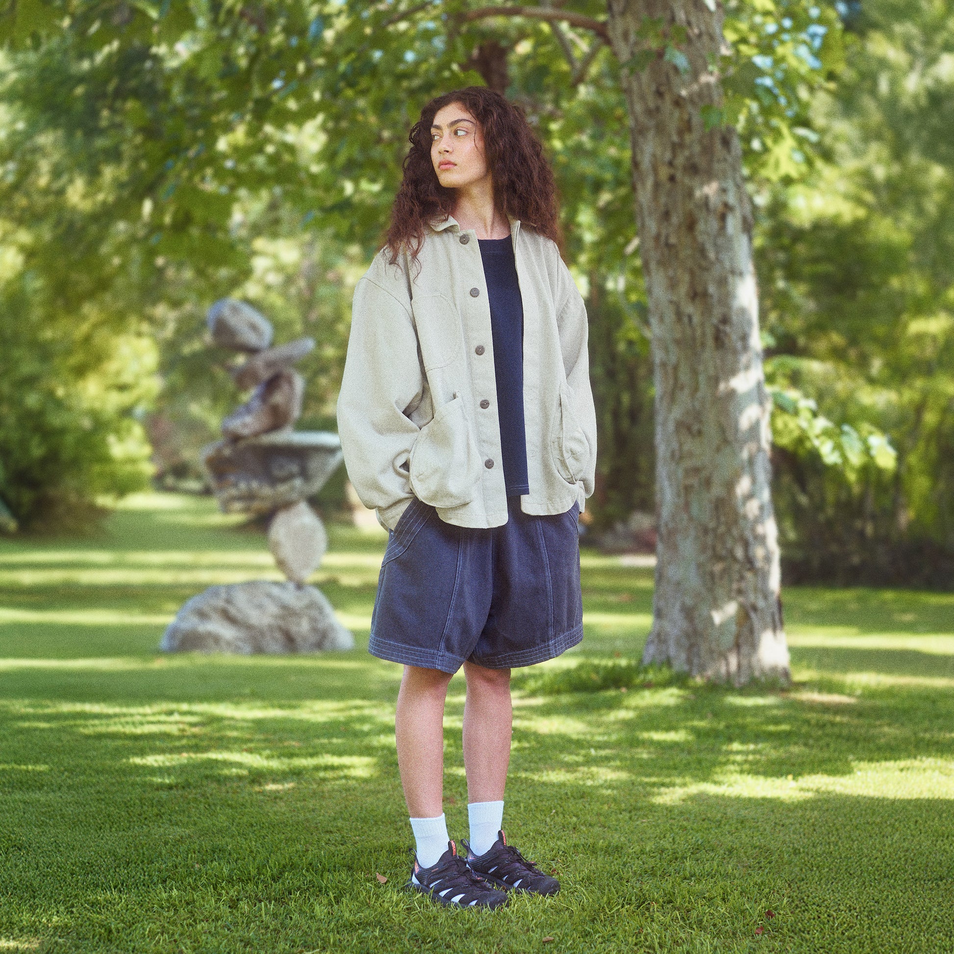 the pebble jacket is designed as a steady form - durable and open to experience. inspired by the act of carefully placing one stone on another, it features two pebble-shaped front pockets, a covered stone-like textured buttons placket, and an oversized, boxy silhouette.